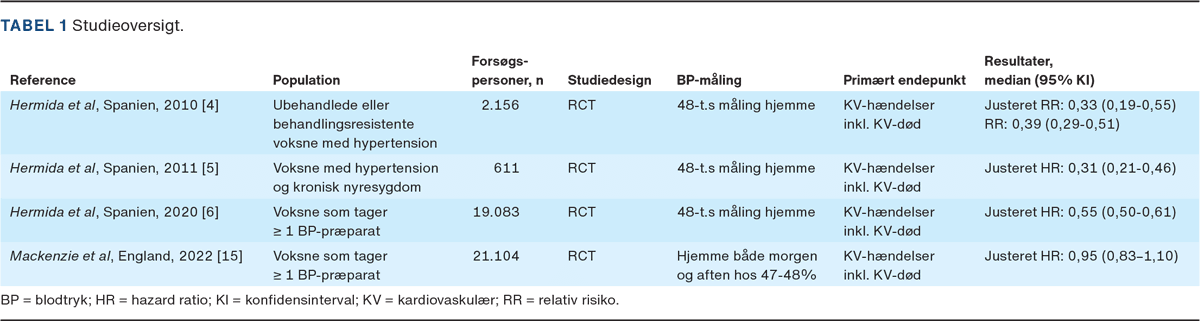 I alle tre studier blev blodtrykket målt hjemme over 48 timer mindst én gang årligt. Derudover gennemgik forskerne manuelt alle patientjournaler for kardiovaskulære hændelser og øvrige vigtige endepunkter én gang årligt, eller når der forelå mistanke om et kardiovaskulært outcome.