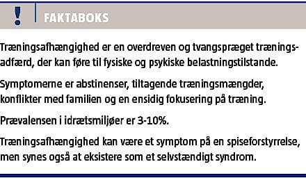 Træningsafhængighed hører til typen adfærdsafhængighed, men der eksisterer endnu ingen entydig definition eller diagnostisk afgrænsning. I 1987 foreslog Veale diagnosekriterier for træningsafhængighed [8]. Kriterierne byggede på alkoholsymptomerne fra den tredje udgave af Diagnostic and Statistical Manual of Mental Disorders (DSM), f.eks. tilvænning, abstinenser og kontroltab. Trods flere tiltag til at underbygge og psykometrisk teste symptomerne i idrætspopulationer er træningsafhængighed end ikke på tegnebrættet i diagnostisk regi. Dog refereres der ofte i empirien til Hausenblas & Downs definition: »Træningsafhængighed er kendetegnet ved overdreven og tvangspræget fysisk træning med negative fysiske, psykiske og sociale konsekvenser« [9].