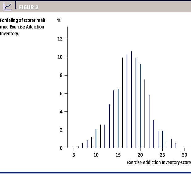 I det første danske studie af træningsafhængighed blev EAI testet på 584 fitnessudøvere og fodboldspillere [4]. Resultaterne fulgte Gaussfordelingen (Figur 2), der illustrerer, at hovedparten af de idrætsaktive i nogen grad genkender symptomerne på træningsafhængighed, men at kun en lille del er i decideret risiko for at være afhængige.