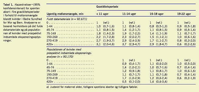 Den første del af tabellen (Tabel 1), som baserer sig på alle kvinderne, viser en øget risiko for spontan abort forbundet med tiltagende motionsmængde sammenlignet med kvinder, der ikke dyrkede motion. Det største risikoestimat ses for spontan abort i uge 11-14, hvor motion i mere end 419 min./ uge var forbundet med en næsten fire gange øget risiko for spontan abort (hazard ratio (HR) = 3,7 (95% konfidensinterval (KI) = 2,9-4,7)). Efter 18 gestationsuger fandt vi ingen sammenhæng mellem motion og spontan abort.