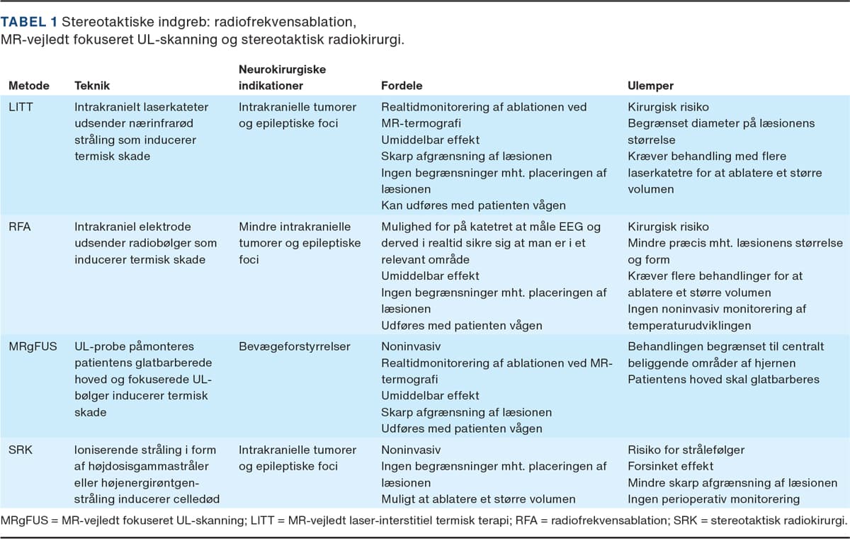 LITT er en tilføjelse til en række innovative stereotaktiske procedurer som radiofrekvensablation (RFA), MR-vejledt fokuseret UL-skanning (MRgFUS) og SRK [24] (Tabel 1). RFA er en teknik, hvor man ligesom ved LITT benytter varmeudvikling til destruering af hjernevæv (Figur 1). I modsætning til RFA har man ved LITT mulighed for at monitorere progressionen af ablationen i realtid samt opnå højere præcision på læsionens størrelse og form. MRgFUS er en ny teknik [25], der overvejes etableret i Danmark som udviklingsfunktion med baggrund i en arbejdsgruppe under Sundhedsstyrelsen til behandling af patienter med essentiel tremor. Ved behandlingen benytter man sig af fokuseret ultralyd til opvarmning af strukturer i hjernen, og den udføres vejledt af MR-termografi med patienten vågen. Det er derfor muligt at vurdere behandlingseffekten undervejs i proceduren (Figur 2). Som følge af kraniets anatomi er det kun muligt at behandle centralt beliggende strukturer, og teknikken egner sig for nuværende ikke til destruktion af større læsioner. SRK er en etableret noninvasiv behandling af hjernemetastaser og andre intrakranielle læsioner, men den er ikke uden bivirkninger i form af strålefølger. I tilfælde af lokalrecidiv efter SRK kan LITT være velegnet som andenbehandling [9, 26].