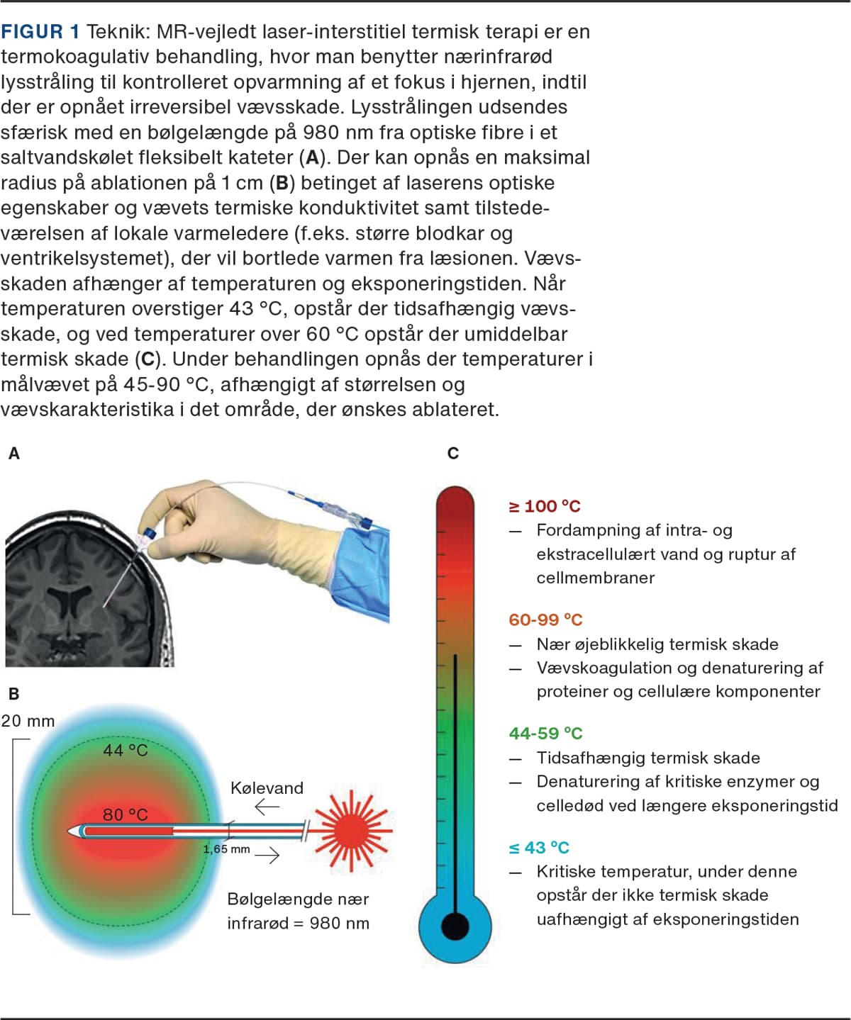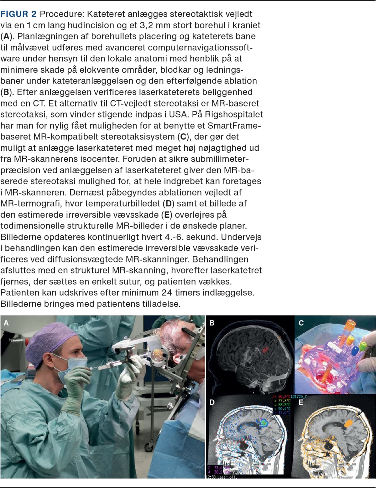 MR-vejledt laser-interstitiel termisk terapi (LITT) er en minimalt invasiv neurokirurgisk teknik, der i den seneste dekade har vundet indpas i behandlingen af dybtliggende og kirurgisk svært tilgængelige forandringer i hjernevæv. I teknikken benyttes et stereotaktisk anlagt laserkateter til opvarmning af det ønskede fokus, vejledt af kontinuerligt opdateret MR-termografi. LITT blev første gang beskrevet i 1983 [1] og blev første gang udført i en hjerne i 1990 [2]. Behandlingen vandt ikke umiddelbart indpas, da der på dette tidspunkt ikke var mulighed for at monitorere temperaturen i hjernen undervejs i behandlingen og derved kontrollere størrelsen af ablationen. Med udviklingen af MR-termografi [3, 4] fik man et pålideligt redskab til i realtid at kunne overvåge temperaturen i hjernen under en ablation. Sammen med et forbedret design af laserkateteret med aktiv køling gav det nu basis for udvikling af et sikkert og pålideligt system til opnåelse af en meget præcis ablation. I 2007 blev det første LITT-system godkendt af Food and Drug Administration, og siden da har behandlingen opnået stigende popularitet i neurokirurgiske centre i USA. I 2018 blev systemet CE-mærket og taget i brug i Europa, og i det seneste år er behandlingen blevet introduceret i Skandinavien. Ligesom i USA er LITT i Europa fortrinsvist blevet anvendt til behandling af primære hjernetumorer, metastaser, strålenekroser samt epileptogene foci hos børn og voksne. I december 2020 blev den første patient behandlet for et recidiv af glioblastom på Rigshospitalet.