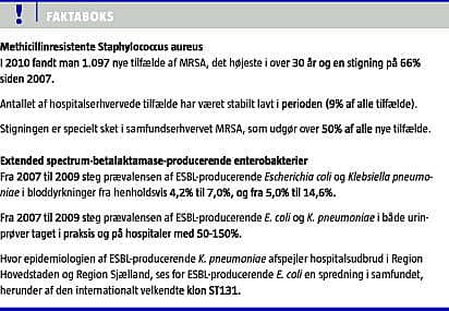 - Skov RL, Urth TR, Hansen DS. Methicillinresistente S. aureus og multiresistente Enterobacteriacea. Ugeskr Læger 2007;169:4259-62.