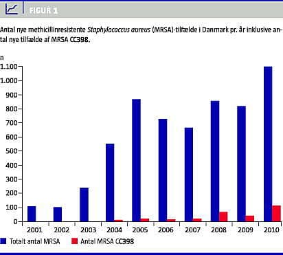 Forekomsten af MRSA har været kraftigt stigende i Danmark siden 2002. Efter en kort stagnation i 2006 og 2007 er antallet af nye MRSA-tilfælde igen steget til 1.097 i 2010, en forøgelse på 66% siden 2007. Forekomsten er mere end tidoblet siden 2001 og er nu den højeste i over 30 år (Figur 1 ).
