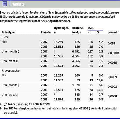 Før 2000 blev ESBL-producerende enterobakterier kun sjældent fundet i Danmark og da oftest i forbindelse med overflytning af patienter fra udlandet. Prævalensen af ESBL-producerende E. coli var 1,3% i 2003 i konsekutive urinisolater fra Hvidovre Hospital [13]. To landsdækkende prævalensundersøgelse af ESBL-producerende E. coli og K. pneumoniae i blod- og urindyrkninger, i september/oktober 2007 og i oktober 2009 viste, at ESBL-producerende bakterier for alvor har etableret sig i Danmark (Tabel 1 ). ESBL-producerende E. coli og K. pneumoniae i bloddyrkninger er fra 2007 til 2009 steget fra 4,2% til 7,0% (p = 0,052) og fra 5,0% til 14,6% (p = 0,0089). For både urinprøver taget i praksis og urinprøver taget på hospitaler ses i samme periode en højsignifikant stigning i prævalensen af ESBL-producerende E. coli og K. pneumoniae på 50-150%. CTX-M enzymer dominerer både hos E. coli (92%) og K. pneumoniae (89%) med CTX-M-15 som hyppigste med henholdsvis 60% og 76% af isolaterne. 43-54% af danske ESBL-producerende stammer har desuden nedsat følsomhed for gentamicin og ciprofloxacin [14].
