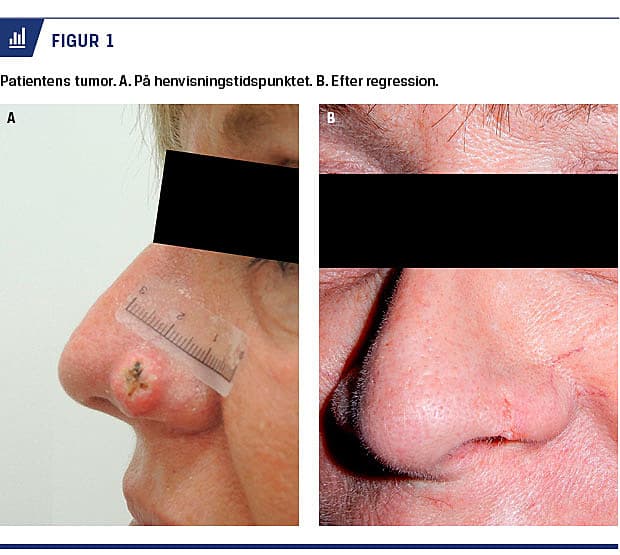 En 57-årig, dansk kvinde blev henvist til Plastikkirurgisk Afdeling, Rigshospitalet, med en hurtigtvoksende tumor af usikker patologi på venstre ala nasi (Figur 1). Elementet havde været til stede i over seks uger og var blevet biopteret to gange. Begge prøver gav usikkert resultat med obs. keratoakantom eller spinocellulært karcinom. Pga. elementets størrelse og lokalisation blev patienten fulgt med ugentlige kontrol af udviklingen frem for excision, og efter tre uger viste elementet spontan regression. Diagnosen keratoakantom blev således bekræftet, og ingen kirurgisk intervention blev foretaget.