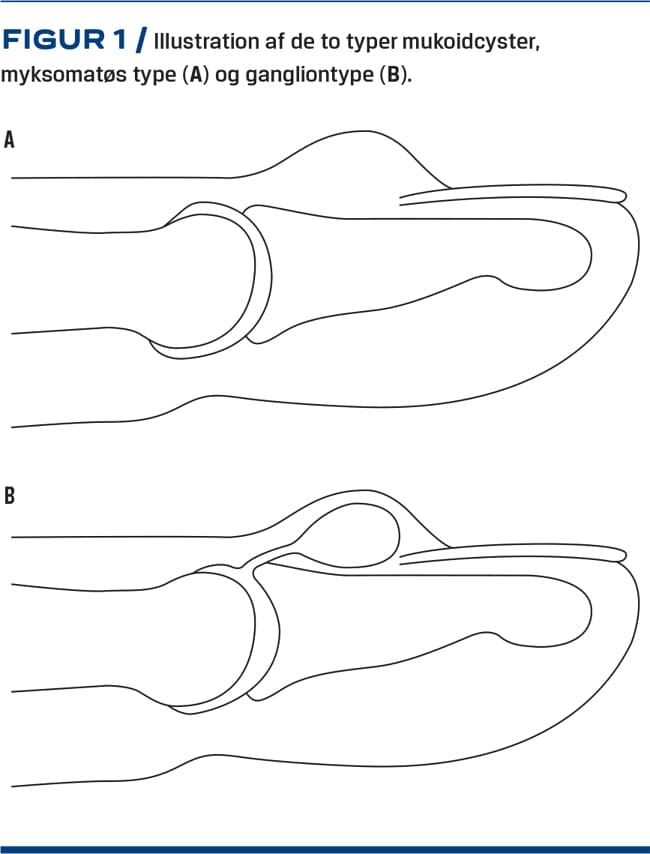 For nuværende mener man, at der findes to typer mukoidcyster (Figur 1), men der er endnu ikke klar evidens for dette. Den ene, myksomatøs type, opstår uden relation til det tilstødende led og betragtes som fokal kutan mukinose [1] med et cystisk rum uden epitelbeklædning. Cysten indeholder mucin og kollagenfibre. Som resultat af degeneration af bindevævet i dermis pga. metaplasi af dermale fibroblaster sker der en overproduktion af hyaluronsyre [1, 3, 4]. Betegnelsen mukoidcyster er egentlig ikke korrekt, da den manglende epitelbeklædning reelt gør dem til pseudocyster [3]. Den anden, gangliontype, opstår pga. herniering af ledkapslen fra et degenerativt led på samme måde som ved et ganglion. Klinisk minder disse cyster dog ikke om andre typer af ganglia. Mukoidcysterne fluktuerer ikke i størrelse, fraset ved spontan udtømning, og der er en tilbøjelighed til, at huden, der ligger henover, bliver tyndere [5]. Nishimura et al påviste, at den kemiske sammensætning af indholdet i cysten var anderledes end i »almindelige« ganglia [6]. Disse cyster opstår ofte i relation til osteoartrotiske led [5]. I et studie fandt man osteoartrose hos 64% af patienterne med den myksomatøse cystetype og hos 91% af patienterne med gangliontypen [1, 7]. Ved gangliontypen kan man med injektion af methylenblåt visualisere en pedikel mellem cysten og et distalt interfalangealled [4, 8]. Dette blev i et studie påvist hos 90% af patienterne, som blev tilbudt operation [9].