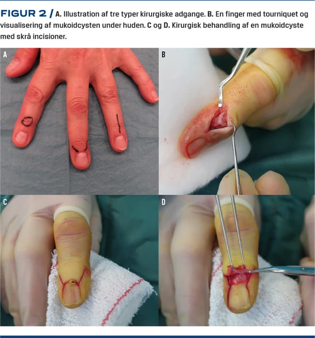 Der er beskrevet mange kirurgiske metoder og teknikker til fjernelse af mukoidcyster [1]. Da cysterne ligger tæt på fire anatomiske strukturer – led, sener, neglelejer og hud – bør man være forsigtig med hudadgange, ekstensorsenen, der hæfter på yderphalanx, og neglematrix (germinal matrix), hvor neglen dannes fra. Matrix kan ved minimale skader give negleforandringer [22, 23].