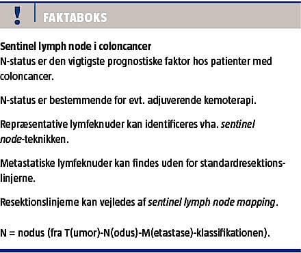 teknikken har endnu ikke fundet sin plads i kolorektal cancer-kirurgien. Årsagerne til dette er formentlig, at tendensen i de seneste år har gået mod ekstensive resektioner, hvor antallet af resecerede lymfeknuder har været et operativt kvalitetsmål [4]. Det har således ikke haft nogen operativ konsekvens, at sentinel lymph nodes blev identificeret.