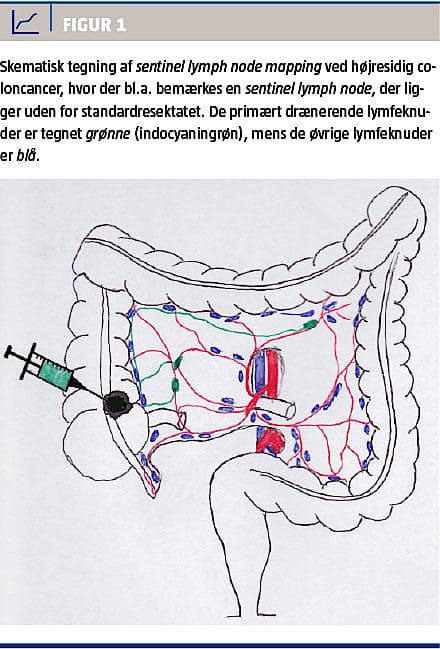 I Danmark diagnosticeres der omkring 4.000 nye tilfælde af kolorektal cancer hvert år [1]. I den vestlige verden er det en af de hyppigste cancerrelaterede dødsårsager [2]. Det har stor prognostisk betydning, om canceren er avanceret, eller om der er mulighed for makroradikal kirurgisk intervention. På diagnosetidspunktet har ca. 25% af patienterne synkrone metastaser i lever eller lunger, og yderligere ca. 25% har spredning til lymfeknuder [1]. Systemisk behandling med kemoterapi har bedret prognosen for patienter med dissemineret kolorektal cancer og har resulteret i en median overlevelsestid på ca. 20 måneder. En betydelig del, op til 40%, af de patienter, der gennemgår intenderet kurativ kirurgi, får efterfølgende recidiv med lokal- og/eller fjernmetastaser [3]. Størstedelen af recidiverne, ca. 80%, sker inden for de første tre år. En vigtig prognostisk faktor efter makroradikal kirurgi er histologisk påvisning af maligne celler i lymfeknuderne. Tilstedeværelsen af lymfeknudemetastaser har sammen med en række andre faktorer betydning for, om patienterne tilbydes adjuverende kemoterapi. På denne baggrund har der i de senere år været stor fokus på de kirurgiske resektionsplaner, antallet af lymfeknuder i resektaterne samt detektion af samtlige, og i særlig grad de maligne, lymfeknuder i resektaterne. Traditionelt set følger resektionslinjerne de vaskulære forhold i colon og det tilhørende krøs. På nogle centre, også i Danmark [4], har man valgt at udføre ekstensive resektioner, hvilket menes at øge radikaliteten, men på bekostning af øget risiko for peri- og postoperative komplikationer [1]. Ved hjælp af sentinel lymph node mapping, hvorved der forstås en kortlægning af de lymfeknuder, der primært drænerer de tumorbærende områder, kan man muligvis målrette resektionslinjerne efter, hvor der med størst sandsynlig-