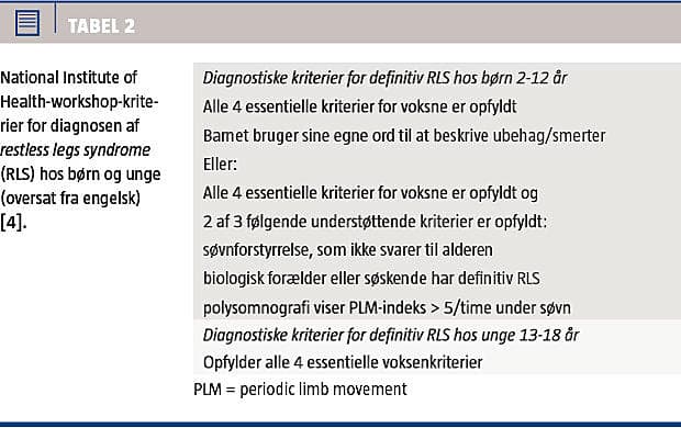 syndrome (RLS) og attention deficit hyperactivity disorder (ADHD) [1-3]. RLS er en neurologisk lidelse, der er karakteriseret ved en uimodståelig trang til at bevæge benene og ledsaget af eller forårsaget af en ubehagelig følelse i benene. Symptomerne forværres eller opstår ved hvile og kan mindskes eller ophøre helt ved bevægelse. Symptomerne er værst om aftenen og natten [4]. Ubehandlet fører tilstanden til ubehag, uro og søvnforstyrrelse, hvilket kan have konsekvenser for livskvaliteten hos både børn og voksne [4, 5].