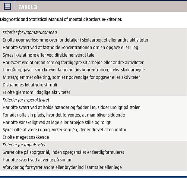 ADHD er en klinisk diagnose, som hos børn stilles på basis af observationer af adfærd. Ifølge diagnosekriterierne for ADHD (Diagnostic and Statistical Manual of mental disorders (DSM) IV) skal mindst seks symptomer på uopmærksomhed og/eller seks symptomer på hyperaktivitet/impulsivitet være til stede (Tabel 3). Symptomerne skal have været til stede i mindst seks måneder og have et sådant omfang, at de forstyrrer barnets funktioner, og i øvrigt være i uoverensstemmelse med barnets alder og udviklingsniveau. Som et vigtigt kriterium skal symptomerne komme til udtryk i to eller flere sammenhænge, f.eks. skole/institution og hjemme. Symptomerne skal have været til stede inden syvårsalderen og må ikke kunne forklares bedre ved en anden diagnose/psykisk forstyrrelse, f.eks. angst eller gennemgribende udviklingsforstyrrelse.