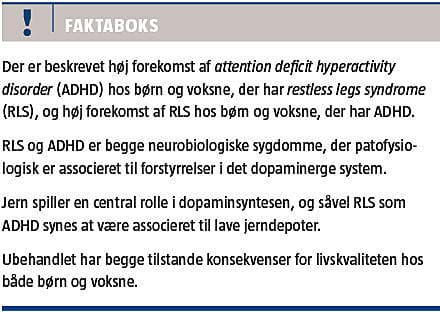 Der er tiltagende evidens for, at jernmangel (S-ferritinniveau < 12 ng/ml) er grundlag for fælles patofysiologiske mekanismer hos patienter med RLS og patienter med ADHD. I et studie med børn med ADHD fandt man RLS hos 33,3% [28]. I et mindre studie med voksne med ADHD fandt man RLS hos 20%. I dette studie syntes samtidig forekomst af RLS at forværre ADHD-symptomerne [29].