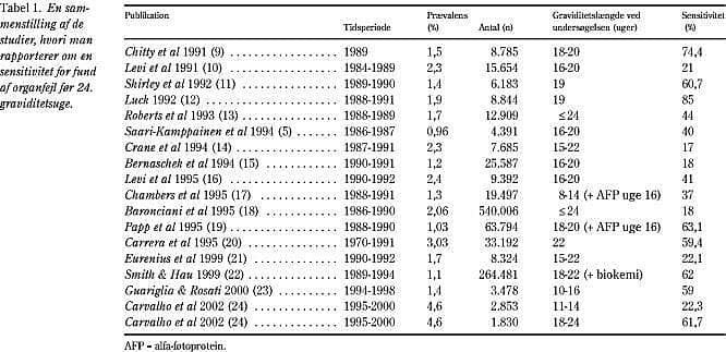 En sammenligning af litteraturen er vanskelig, idet tidspunktet i graviditeten, hvor undersøgelsen blev udført, populationen, som blev undersøgt, og eksklusionskriterierne var meget varierende (Tabel 1 ). I tre studier fastslås det, at detektionsraten for misdannelser i første trimester ikke er tilstrækkelig høj til at kunne erstatte andet trimesters misdannelsesscanning (17, 23, 24).