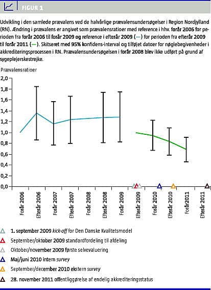 Figur 1 viser udviklingen i den samlede prævalens ved de halvårlige prævalensundersøgelser i RN angivet som prævalensratioer med reference i hhv. forår 2006 og efterår 2009. I figuren er desuden anført nøglebegivenheder i akkrediteringsprocessen. I perioden fra forår 2006 til forår 2009 var prævalensen af nosokomielle infektioner svagt stigende, dog uden statistisk signifikans. I perioden fra efterår 2009 til forår 2011 var der et fald i den samlede prævalens parallelt med akkrediteringsprocessen.