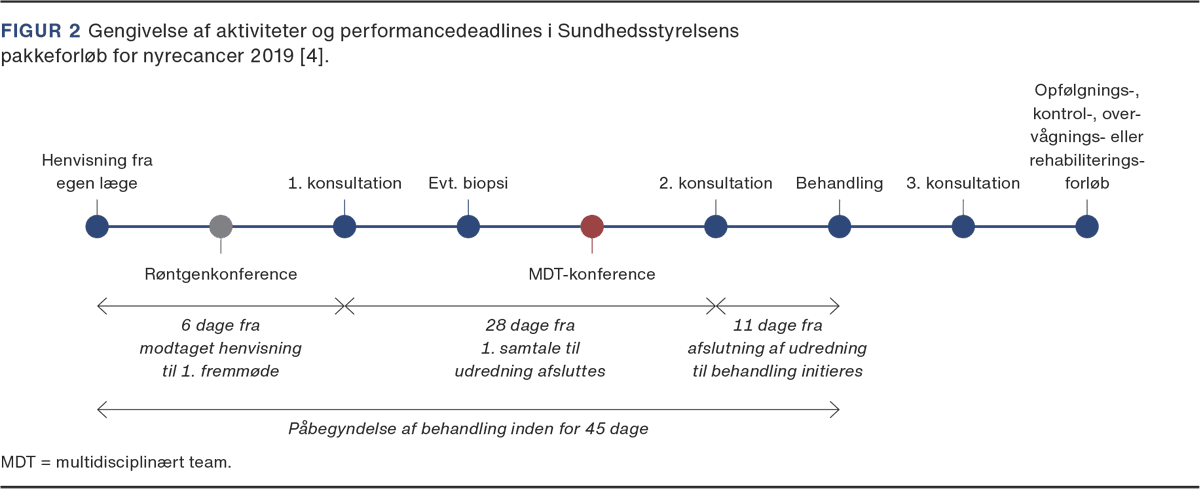 MDT-konferencer udgør et centralt omdrejningspunkt i kræftpakkerne, hvor behandlingsanbefalinger fastlægges. Mødet markerer typisk afslutningen på den diagnostiske fase (Figur 2). Forud herfor samles undersøgelsesresultater og patientoplysninger i et MDT-oplæg. På mødet drøftes ofte, men ikke begrænset til, 1-30 patienter, og der udformes konsensusbaserede anbefalinger for deres videre forløb. MDT-konferencer organiseres af den patientansvarlige afdeling, oftest kirurgi, mens øvrige specialer deltager afhængigt af cancerform. I de seneste år er der etableret nationale MDT-konferencer for flere cancerformer, bl.a. pancreas- og oesophaguscancer samt cytoreduktiv kirurgi [5]. Patient og pårørende deltager normalt ikke i MDT-konferencer, men siden 2015 har der ved øre-næse-hals-MDT-konferencer været fast patientinvolvering i alle regioner. Det sker som regel i umiddelbar forlængelse af MDT-konferencen, hvor forløbet drøftes og planlægges sammen med patienten for at styrke inddragelsen og for at effektivisere forløbene af en hurtigt progredierende sygdom [6].