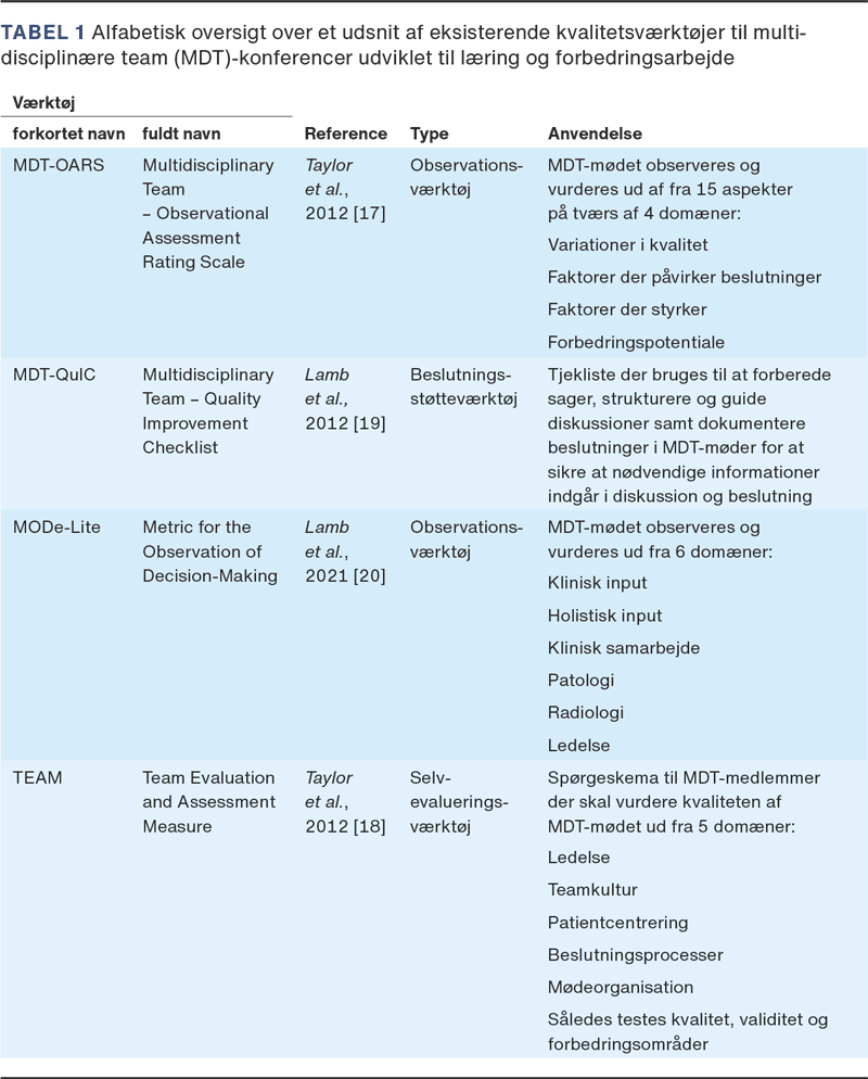 Internationalt er der dog bred enighed om, at MDT-konferencer styrker patientforløb bl.a. gennem mere præcis stadieinddeling, mere målrettet behandling, færre akutte indlæggelser og kortere indlæggelsestider, hvilket er forbundet med forbedret overlevelse [5, 10]. Flere studier fremhæver også gevinster for samarbejde, kommunikation og professionel trivsel [13, 14], mens andre peger på barrierer og behov for kvalitetsforbedring [15, 16]. Til dette formål er der i Storbritannien udviklet en række evaluerings- og optimeringsværktøjer [17-20] (Tabel 1).