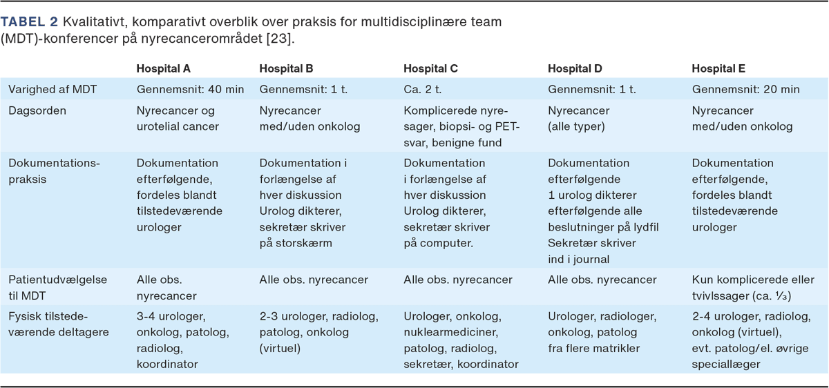 Bottom-up-implementeringen af MDT-konferencer i Danmark har på den ene side skabt stærk, faglig forankring og lokal tilpasning. Det har på den anden side medført betydelig variation i bl.a. mødestruktur, deltagerkreds og patientudvælgelse. Et medicinsk-antropologisk ph.d.-projekt [23] beskriver MDT-konferencer som en »standard med variation«, hvor forskelle ses selv inden for samme sygdomsområde. Dette ses f.eks. på nyrecancerområdet (Tabel 2), og samme mønster er også dokumenteret ved lungecancerområdet [25]. Variationerne peger på behovet for at synliggøre og evt. reducere uhensigtsmæssige forskelle for at sikre mere ensartede beslutningsprocesser og patientforløb på tværs af landet.