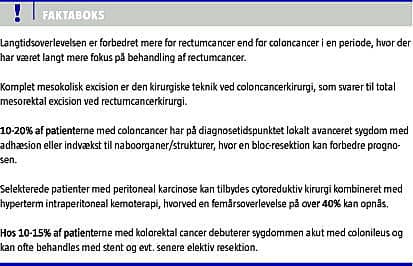 Overlevelse efter colon- og rectumcancer er forbedret over tid både i udlandet og i Danmark. De største fremskridt er dog sket for rectumcancer, hvor femårsoverlevelsen på 55% for mænd nu har overhalet femårsoverlevelsen på 52% for mænd med coloncancer [1]. En tilsvarende udvikling, uafhængig af køn, er observeret i f.eks. Sverige [2]. Denne forskel må tilskrives, at der for rectumcancer har været megen fokus på at optimere kirurgien, total mesorektal excision, og prioritere det multidisciplinære samarbejde. Indførelsen af præoperativ neoadjuverende stråleterapi har udelukkende bidraget til bedre lokal kontrol [3]. En sådan udvikling er ikke sket for coloncancer. De seneste år er der dog kommet fokus på betydningen af den mesokoliske excision ved coloncancer. Herudover er der ved coloncancer tre områder, der giver særlige udfordringer for behandlerne: lokalt avanceret coloncancer, coloncancer med lokal karcinose og patienter som debuterer akut med ileus eller perforation. Disse forhold gennemgås nedenfor.