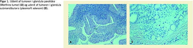 Histologien bekræftede FNA-diagnosen (Figur 1 ). I gl. parotidea fandt man mikroskopisk en tumor, der havde adenopapillære og cystiske strukturer og var beklædt med toradet onkocytært epitel. Subepitelialt blev der fundet lymfoidt væv med kimcentre. Der var ingen tegn på malignitet. I gl. submandibularis var der en tumor, som overalt var velafgrænset mod det omgivende spytkirtelvæv. Selve tumoren havde vekslende udseende med ligeligt fordelt stromal og epitelial komponent og dukter. Der fandtes ingen tegn på malignitet. Der var således tale om WT i gl. parotidea og PA i gl. submandibularis.