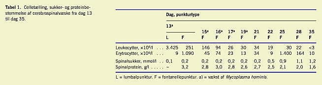 Der var ukompliceret graviditet frem til fire dage før fødslen, hvor mater fik feber og influenzalignende symptomer. Der var tillige tegn på begyndende fødsel. Mater blev behandlet med vehæmmende medicin, betamethason, ampicillin og metronidazol, der senere blev suppleret med gentamicin pga. leucocytose og fortsat febrilia. Fødslen lod sig ikke bremse, og barnet, en pige, blev født ved en normal vaginal fødsel i uge 28 + 1. Fødselsvægt = 1.255 g. Apgarscore 9/1 min, 9/5 min. De første dage var barnet stabilt med helt alderssvarende adfærd. C-reaktivt protein var < 10 mg pr. l. På dag 6 var der tiltagende bradykarditendens. Der blev taget blod og luftvejssekret til dyrkning, og der blev påbegyndt behandling med ampicillin 200 mg pr. kg pr. dag og gentamicin 5 mg pr. kg hver 48. time. To dage senere blev der fundet vækst af Staphylococcus epidermidis i en bloddyrkning, og den antibiotiske behandling blev ændret til cefuroxim 50 mg pr. kg pr. dag og gentamicin. Ved en ultralydskanning (UL) af cerebrum sås en lille blødning i højre lateralventrikel - grad 2 jf. klassifikation ad modum Papille [1]. De følgende dage var der tiltagende apnøtendens, og behandlingen blev suppleret med doxapram (respirationsstimulerende) 0,5-2,5 mg pr. kg pr. time. Ved en ny UL på dag 13 sås dilatation af hjernens lateralventrikler. Der var ingen yderligere blødning. Ved en lumbalpunktur blev der fundet 3.425 leucocytter pr. ml, ni erytrocytter pr. ml og lavt spinalglukose (Tabel 1 ). Der blev ikke fundet nogen mikroorganismer ved direkte mikroskopi. På mistanke om meningitis blev der iværksat behandling med ampicillin 400 mg pr. kg pr. dag og cefotaxim 150 mg pr. kg pr. dag. Fra dag 13 til dag 19 blev pigen tappet fem gange via fontanellepunktur som aflastende behandling af hydrocefalus. På dag 19 var der vækst af gramnegative stave i cerebrospinalvæsken (CSV), og behandlingen blev suppleret med ciprofloxacin 20 mg pr. kg pr. dag i ni dage. Senere identificeredes væksten i CSV som Mycoplasma hominis følsom for ciprofloxacin. M. hominis blev påvist i alle CSV-prøver, der var taget før ciprofloxacinbehandlingen, mens alle efterfølgende CSV-prøver var uden vækst. C-reaktivt protein steg fra dag 17 til dag 20 til 25 mg pr. l for igen at normaliseres over seks dage. Udvikling i celletælling af spinalvæsken, spinalglukose og spinalprotein fremgår af Tabel 1.
