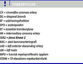 Blodkoncentrationen af trombocytter var på 933 × 109 /l, og hæmoglobinkoncentrationen var på 10,9 mmol/l. Patienten blev henvist til Hæmatologisk Afdeling med henblik på udredning for MPD. Undersøgelse med polymerasekædereaktion for JAK2-mutation var negativ. Knoglemarvundersøgelse var forenelig med diagnosen ET. Opfølgende blodprøver viste et vedvarende forhøjet trombocyttal > 850 × 109 /l. Hæmoglobinkoncentrationen var på 9,5 mmol/l. Der var normal leukocytkoncentration og hæmatokritværdi samt normal serumerytropoietin (EPO) og normalt erytrocytvolumen. Man påbegyndte behandling med interferon-α med reduktion af trombocyttallet til følge. Ved opfølgende kontroller i hjertesvigtsklinikken var patienten velbefindende og klinisk velkompenseret. Efter fuld optitrering af antikongestiv behandling var EF 45%.