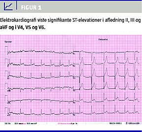 En tidligere fuldstændig rask mand på 22 år blev indlagt fra skadestuen, efter at han i et par dage havde haft intermitterende brystsmerter. Der var, bortset fra rygning, ikke kendskab til dispositioner for iskæmisk hjerte-kar-sygdom hos patienten. Der var ingen anamnestiske informationer om misbrug. På indlæggelsesdagen oplevede patienten en kraftig forværring af brystsmerterne med nærsynkope. Med elektrokardiografi påviste man signifikante ST-elevationer i afledning II, III og aVF og i V4, V5 og V6 (Figur 1 ). Acetylsalicylsyre-, clopidogrel- og heparinbehandling blev iværksat efter vanlig instruks for behandling af ST-elevationsmyokardieinfarkt (STEMI).