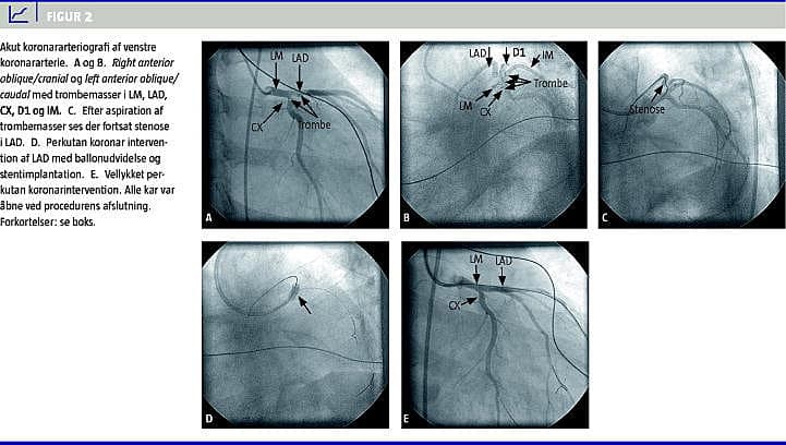 Akut koronararteriografi (KAG) viste trombemasser i hovedstammen, left anterior descending artery (LAD) og ramus circumflexus, diagonalgrenen og intermediærgrenen. Efter aspiration af trombemasserne var der stadig mistanke om en fikseret stenose proksimalt i LAD. Derfor blev der i umiddelbar forlængelse af undersøgelsen foretaget primær perkutan koronarintervention med indsættelse af en drug-eluting stent i LAD. Alle kar var åbne ved procedurens afslutning (Figur 2 ). Behandling med glykoprotein IIb/IIIa-hæmmeren abciximab blev opstartet under proceduren. De biokemiske test viste forhøjede serumværdier af kreatininkinase-myocardial band -masse (CKMB 9,2-236 mikrogram/l) og troponin-T (TNT 0,20-5,33 mikrogram/l). Totalkolesterol blev målt til 3,5 mmol/l. Patienten blev efterbehandlet med 75 mg clopidogrel i 12 måneder og derefter sat i behandling med 75 mg acetylsalicylsyre daglig resten af livet. Ekkokardiografi viste global hypokinesi, der dog var mest udtalt anteroseptalt, og en estimeret uddrivningsfraktion (EF) på 20%.