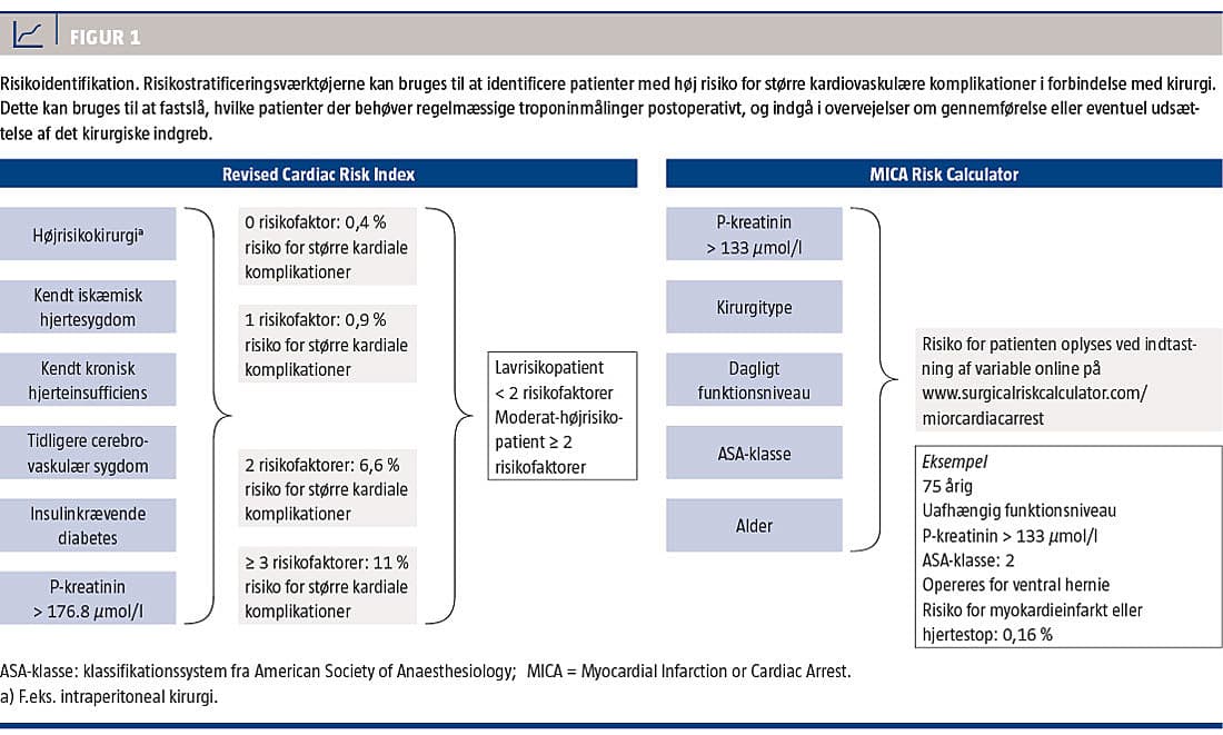 Revised Cardiac Risk Index har i mange år været det mest anvendte værktøj til vurdering af risikoen for perioperative kardiovaskulære komplikationer [26] (Figur 1). Indekset er kritiseret for at være baseret på et begrænset datamateriale og ikke at omfatte akut kirurgi, som er en af de stærkeste prædiktorer for perioperative kardiovaskulære komplikationer [4]. American College of Surgeons har med en multicenterdatabase med over 250 hospitaler udviklet et nyt stratificeringsværktøj ved gennemgang af over 200.000 ikkekardiale kirurgiske patienter [27] (Figur 1). Denne stratificering har ift. Revised Cardiac Risk Index vist sig at være overlegen til prædiktion af risikoen for PMI og hjertestop efter ikkekardial kirurgi.