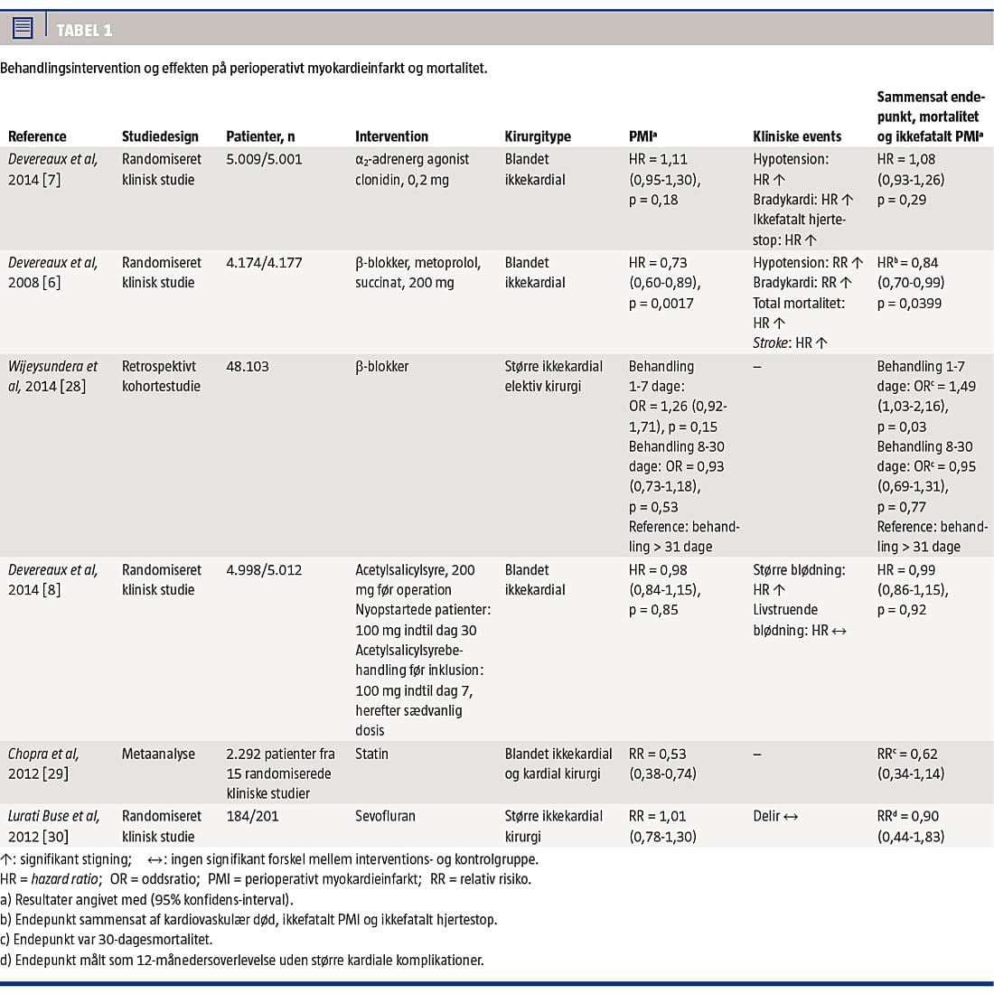 I et randomiseret klinisk studie med 8.351 ikkekardiale kirurgiske patienter undersøgte man effekten af metoprolol på forekomsten af kardiovaskulær død, ikkefatalt PMI og ikkefatalt hjertestop [6]. Behandlingen blev påbegyndt få timer før kirurgi og fortsatte indtil 30 dage postoperativt. Interventionen gav signifikant lavere hazard ratio (0,73; 95% konfidens-interval (KI): 0,60-0,89) for PMI [6], men medførte en signifikant stigning i den totale mortalitet og incidens af cerebralt insult.