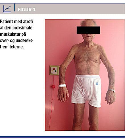 Ved indlæggelsen fandt man atrofi af den proksimale muskulatur på over- og underekstremiteterne (Figur 1) samt kraftnedsættelse, svage reflekser og bevaret sensibilitet overalt. Han havde ved indlæggelsen været i medicinsk behandling for hypertension med amlodipin 10 mg dagligt igennem to år og med simvastatin 80 mg dagligt igennem halvandet år. Ved gennemgang af hans digitale medicinprofil fremgik det, at han to uger forud for indlæggelsen var sat i behandling med roxithromycin 300 mg dagligt i syv dage mod infektion.