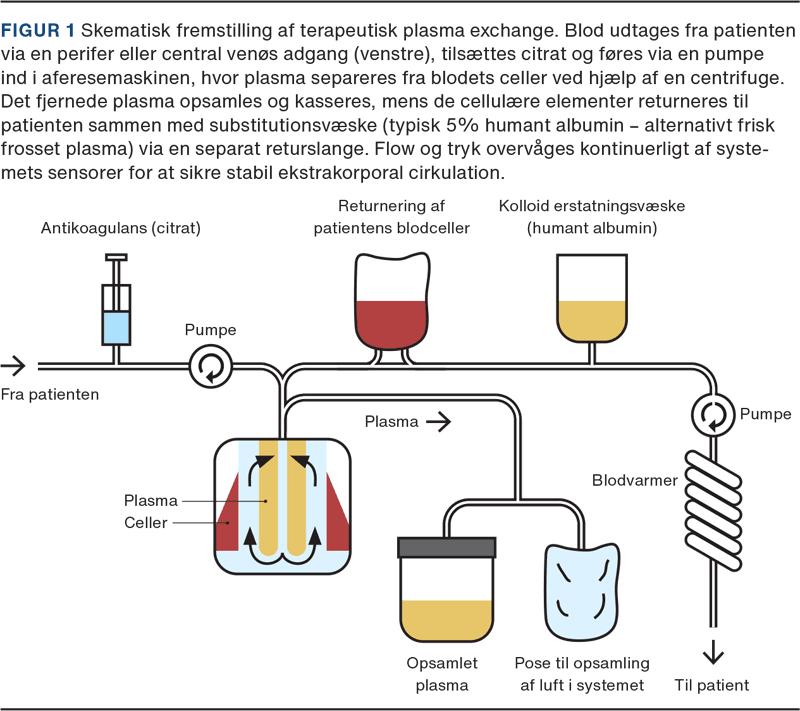 Plasmafereseproceduren udføres med en aferesemaskine, som skematisk visualiseret i Figur 1. Patienten kobles til maskinen igennem to perifere venøse adgange, én i hver albuebøjning, som anlægges UL-assisteret. Der udskiftes 1-1,5 gange plasmavolumen pr. behandling, hvilket svarer til 2-3 l, som substitueres med erstatningsvæske i form af humant albumin eller donorplasma. Kontinuerlig citrattilførsel sikrer nødvendig antikoagulation, når blodet befinder sig ekstrakorporalt. Én behandling varer ca. 1,5-3 timer afhængig af patientens blodvolumen. Behandlingsforløbets tilrettelæggelse vil være afhængig af den kliniske indikation, men i de fleste tilfælde planlægges 5-7 behandlinger over en periode på 10-14 dage. Herefter vurderes behovet for behandlingsophør eller sjældnere overgang til vedligeholdelsesbehandling, typisk bestående af 1-4 behandlinger pr. måned, afhængigt af sygdom og klinisk respons [3].