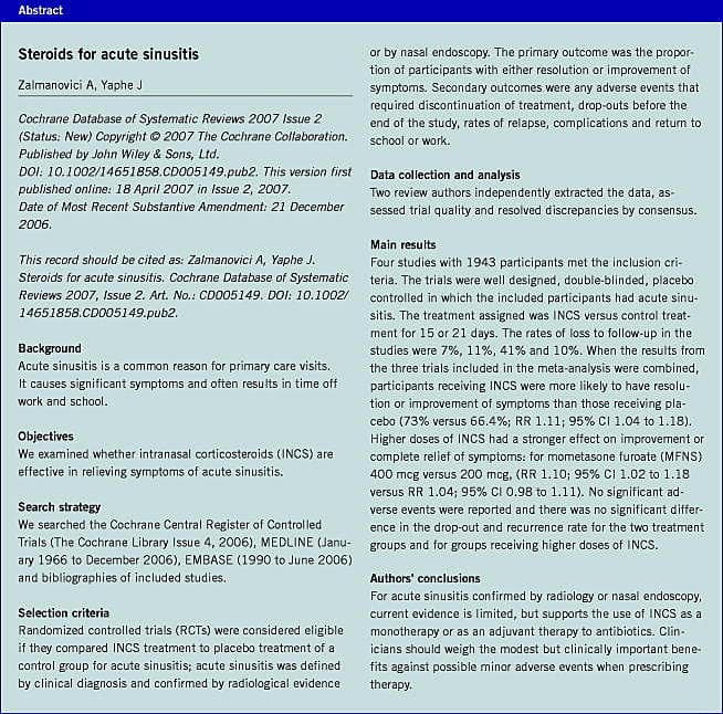- Zalmanovici A, Yaphe J. Steroids for acute sinusitis. Cochrane Database of systematic reviews 2007, Issue 2. Art.No.:CD005149. DOI:10.1002/ 14651858.CD005149.pub2.