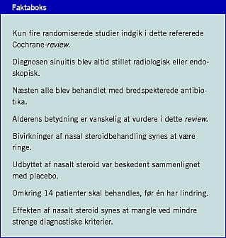 Min konklusion efter at have læst dette Cochrane-review er, at jeg nok noget hyppigere end tidligere vil overveje at behandle patienter med akut sinuitis med nasalt steroid. Dette vil særligt gælde patienter, hvor der ikke er tvivl om diagnosen, og patienter, der allerede har brugt detumeserende næsedråber/ spray i en uges tid uden særlig effekt, og hvor næseslimhinden er ved at være godt irriteret. Vi må afvente yderligere veltilrettelagte randomiserede undersøgelser, før en endelig vur-dering af intranasal steroidbehandling til patienter med akut sinuitis er mulig.