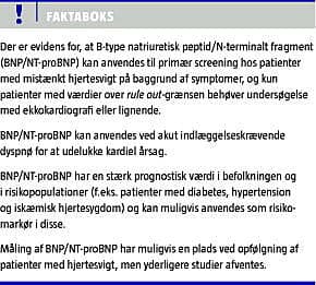 At det bør fremhæves, at BNP/NT-proBNP-plasmamåling aldrig kan stå alene, men skal indgå i vurderingen sammen med anamnese, objektiv undersøgelse, hjertestetoskopi og EKG.