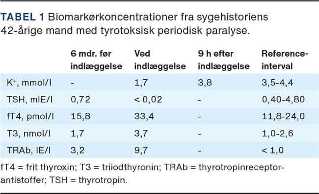 En 42-årig mand af kinesisk herkomst havde haft Graves’ sygdom siden 2019. Han blev henvist til en akutmodtagelse i februar 2021 pga. nedsat kraft i begge arme og ben. Symptomerne var debuteret to uger tidligere med episodisk nedsat kraft i begge ben ved opvågning, men symptomerne fortog sig sædvanligvis i løbet af formiddagen. På indlæggelsesdagen vågnede patienten med svært nedsat kraft i begge ben og kunne ikke komme ud af sengen. I løbet af formiddagen tilkom der tiltagende nedsat kraft i begge arme. Ved hospitalskontakt blev der påvist nedsat, men egal kraft i over- og underekstremiteterne svarende til kraftgrad 1-2 over hofte, knæ og ankelled, to over skulder og fire over albue og håndled bilateralt. Der blev fundet normal tonus og normale, egale dybe senereflekser i over- og underekstremiteterne. Der var normal sensibilitet for berøring, stik, proprioception, temperatur og vibration i alle ekstremiteter. Biokemisk fandt man hypokaliæmi med kalium på 1,7 mmol/l og hypertyreose (Tabel 1). Et ekg viste normofrekvent sinusrytme. Ved seneste thyroideakontrol ca. seks måneder forinden var patienten eutyroid på behandling med tablet thiamazol 5 mg × 1 dagligt (Tabel 1).