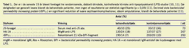 LPS er i de sidste par år blevet gjort til genstand for omfattende forskning i forbindelse med udvikling af behandlingsstrategier. Da LPS ses som den primære proinflammatoriske del af N. meningitidis, kan en behandling, der neutraliserer dets effekt, evt. vise sig at være gavnlig for sygdommens udfald (Tabel 1). I eksperimentelle studier har flere antiendotoksinbehandlinger vist sig at være effektive [1]. Disse er dog ikke effektive, efter at shock er indtrådt [1], og indtil videre er det ikke lykkedes med specifikke anti-LPS-behandlinger at øge overlevelseschancerne signifikant ved meningokokinduceret septisk shock [9, 10]. Derimod har behandling med bactericidial permeability increasing protein (rBPI21), der neutraliserer lipid A, vist sig at reducere svære komplikationer ved septisk shock [10, 11].