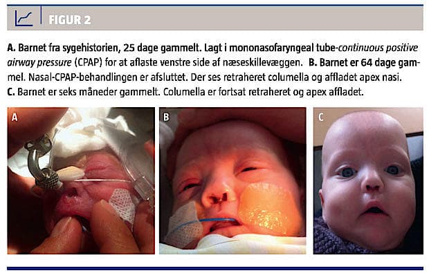 lingen fortsat indiceret 25 dage efter fødslen, hvor der sås et dybt sår fortil på venstre side af næseskillevæggen og columella, overgangen mellem septum og filtrum. Pigen blev i en kort periode lagt i mononasofaryngeal tube-CPAP gennem højre næsekavitet for at aflaste venstre side af næseskillevæggen (Figur 2A), men koagler stoppede tuben til.