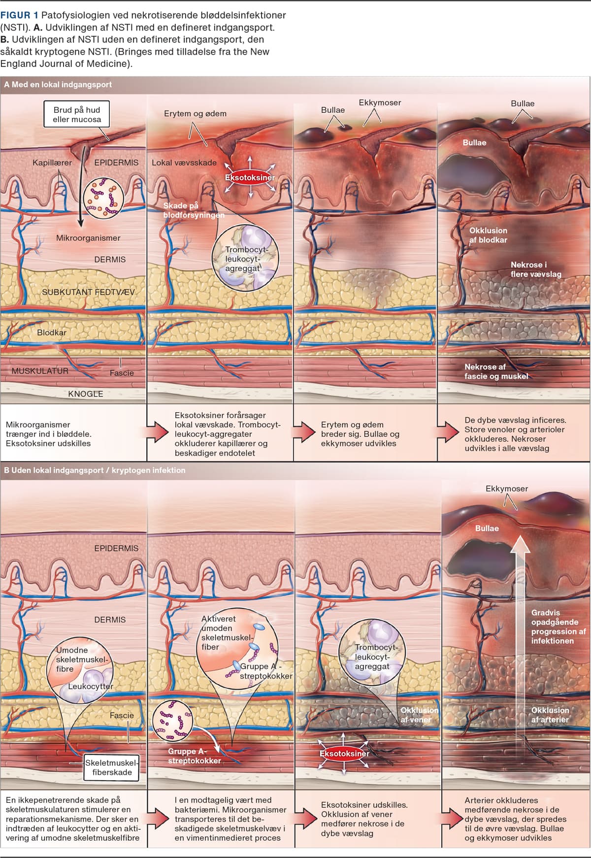 Fælles for de infektioner, som fører til NSTI, er udskillelsen af eksotoksin, der medfører agglutination af granulocytter og trombocytter, hvorved der udvikles cellerige tromber i de perifere arterier [6, 7]. Herved udvikles der lokal hypoperfusion, iskæmi og nekrose (Figur 1) [8].