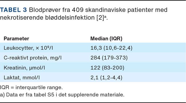 Som det fremgår af Tabel 3, ses der i blodprøver taget ved modtagelsen af patienter med NSTI markant forhøjet C-reaktivt protein (CRP)-niveau, en vis grad af leukocytose og let forhøjelse af kreatininniveauet. Særligt det betydeligt forhøjede CRP-niveau skal give mistanke om NSTI.