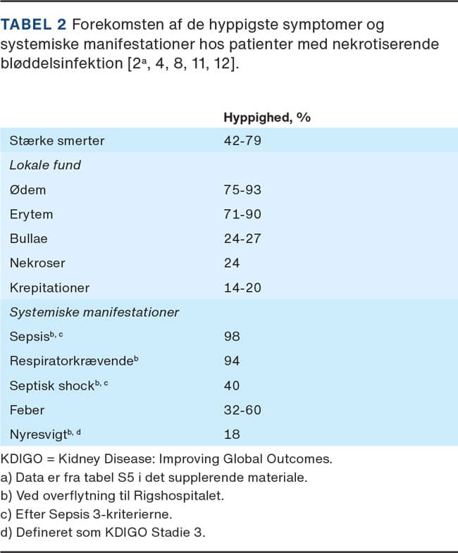Mistanken om NSTI kan opstå på baggrund af både de lokale fund, graden af smertepåvirkning og systemisk påvirkning af patienten.De hyppigste lokale og systemiske manifestationer er samlet i Tabel 2. Bemærk at de uspecifikke symptomer erytem og ødem oftest ses, og at der hyppigt forekommer (stærke) smerter, mens krepitationer, bullae eller nekroser i huden kun forekommer hos under en tredjedel af patienterne. De fleste udvikler sepsis og får behov for behandling på en intensivafdeling i forløbet [2, 4, 8, 11, 12].