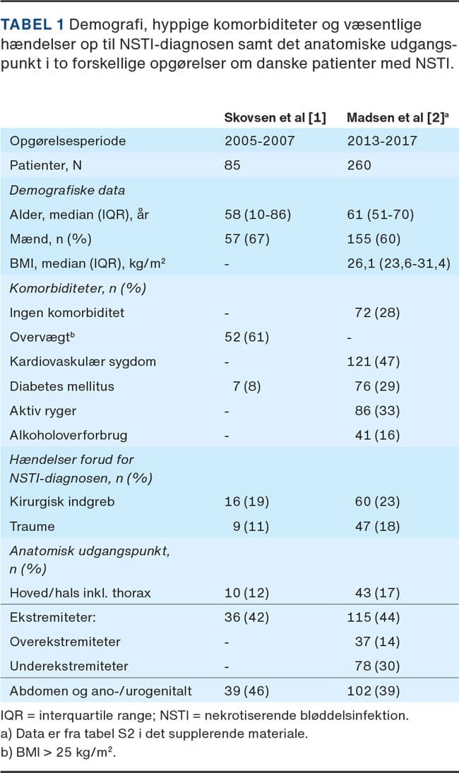 Sygdommen er sjælden med en anslået incidens på 0,77 tilfælde pr. 100.000 borgere pr. år i Danmark [1]. I studier fra Danmark og det øvrige Skandinavien er 30-dagesmortaliteten 8-14%, mens der internationalt i øvrigt rapporteres om mortalitetsrater, der spænder meget vidt, oftest på 15-45% [1, 2, 10]. I Tabel 1 vises data for danske patienter med NSTI i to forskellige opgørelser. Bemærk at 30-40% havde været udsat for et traume eller et kirurgisk indgreb op til diagnosen, og at mere end hver fjerde patient var uden kendt komorbiditet på diagnosetidspunktet, hvilket er sammenligneligt med fund fra andre vestlige lande [4].