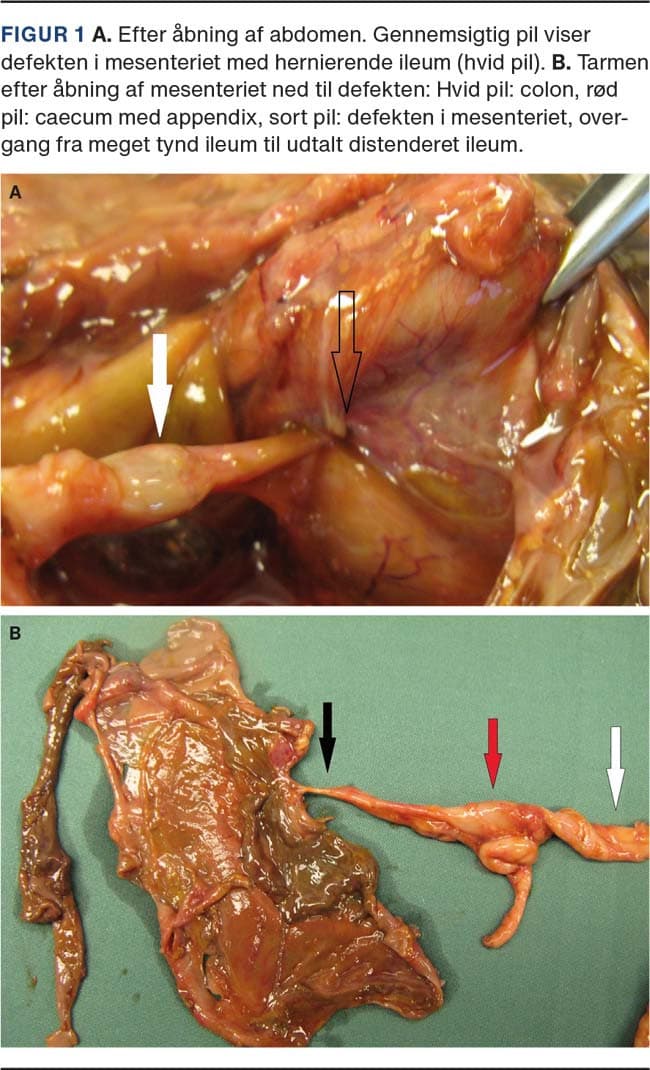 Ved obduktionen fandtes en dreng med kranieomfang på 32,5 cm og forstørret abdominalomfang på 35,5 cm. Åbning af peritoneum var vanskelig pga. udtalte adhærencer af et ca. 50 cm langt ileumsegment med dilatation op til 4 cm. Der var peritonitis med fibrin- og mekoniumbelægninger i peritoneum, hvorfor man havde mistanke for tarmruptur. Årsagen til ileumdilatationen fandtes i transmesenteriel herniering (Figur 1). Den sandsynlige tarmruptur samt blødning fra nekrotisk tarm vurderedes at være årsagen til anæmien. Derudover var den ekstremt dilaterede ileum årsag til et meget højtstående diafragma, hvilket førte til mangelfuld udvikling af lungerne.