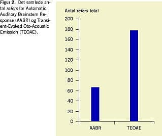 I udenlandske studier, hvori man belyser hørescreening, svinger antallet af refers, dvs. antallet af patologiske svar med behov for yderligere undersøgelse, betydeligt afhængig af metode og udstyr. TEOAE-refer- raten svinger fra 5,8% til 33,3% [3-7], og for AABR fra 1,2% til 13,2% [4, 6-10].