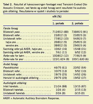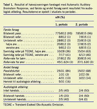 Resultater: Af de 1.627 børn udviste 67 (4%) refer- svar på et eller begge ører ved AABR og 177 (11%) ved TEOAE. Der ses en statistisk signifikant forskel på antallet af refers mellem de to metoder (p = 2,43 × 10 -16 ). Efter andet screeningsforsøg og udredning på audiologisk afdeling udviste fem af børnene et reelt høretab. Tidsforbruget var i gennemsnit 6,6 minutter ved AABR og 3,8 minutter ved TEOAE.