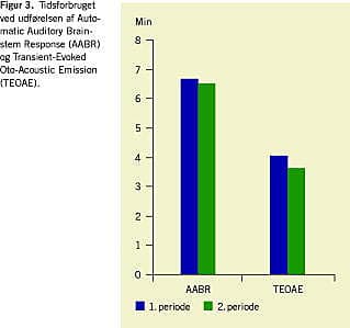 Første undersøgelse var af praktiske grunde altid AABR. Tiden fra undersøgeren begyndte at montere måleudstyret på barnet til den første undersøgelse blev påbegyndt, blev noteret som monteringstid for AABR. En tilsvarende monteringstid for TEOAE findes ikke. Det tog henholdsvis 6,6 minutter at udføre AABR og 3,8 minutter at udføre TEOAE. Tidsforbruget, opdelt i de to perioder, er vist i Figur 3 .