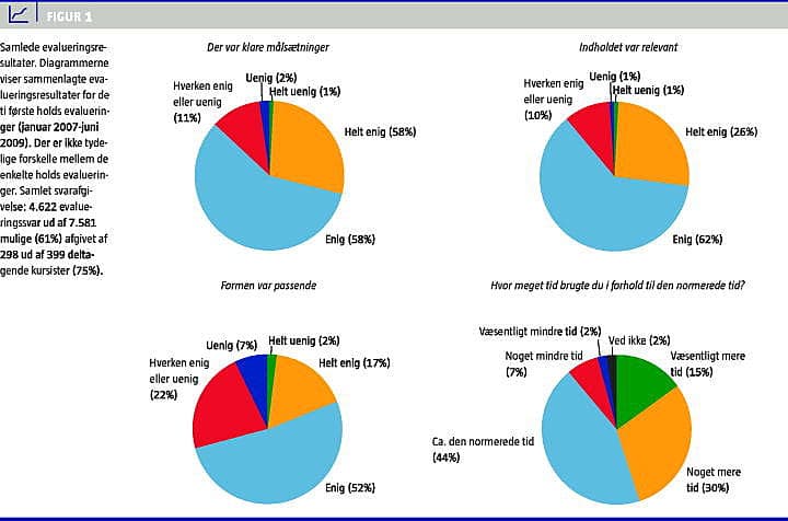 Kursisterne er efter hvert modul blevet bedt om via elektroniske spørgeskemaer at vurdere, om der var klare mål for modulet, om indholdet var relevant, om undervisningsformen passede til målet, og om tidsforbruget var som forventet. Samtidig har kursisterne kunnet kommentere og foreslå forbedringer. Evalueringerne er generelt positive (Figur 1 ). I evalueringerne fra de to første hold anførte kursisterne i 55% af de afgivne svar, at de havde brugt mere end den normerede tid på kurset. I foråret 2008 gennemførtes justeringer i kurset med henblik på at reducere tidsforbruget. Meget få kursister har givet udtryk for vanskeligheder med at bruge e-læringsværktøjet eller med at finde sig tilrette i undervisningsformen.