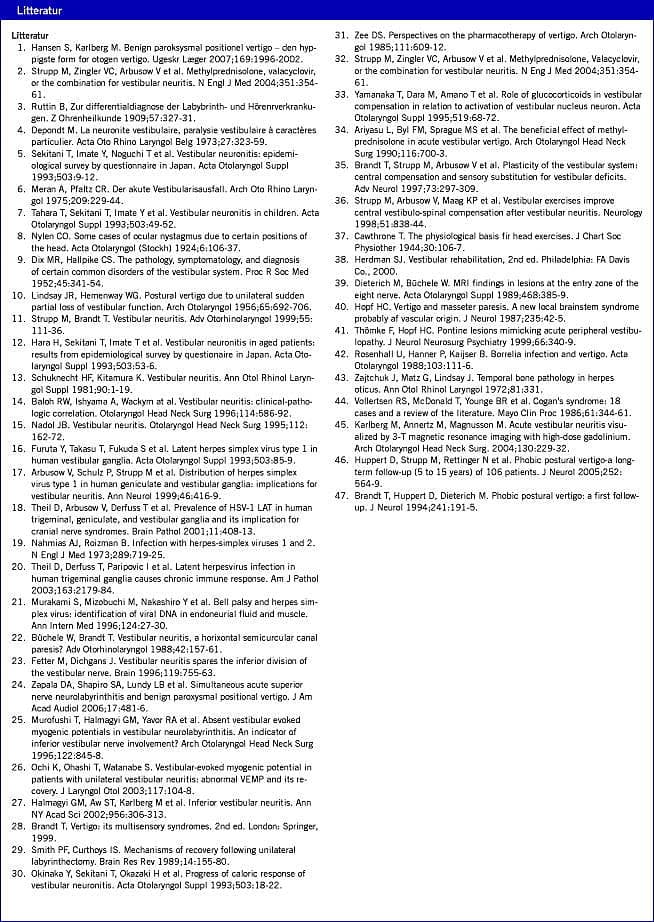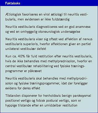Summary Vestibular neuritis Ugeskr Læger 2008;170(21):1809-1815 Vestibular neuritis is the second most common cause of peripheral vestibular vertigo. Its assumed cause is a reactivation of herpes simplex virus type 1 infection. Methylprednisolone significantly improves the recovery of peripheral vestibular function in patients with vestibular neuritis. Clinical studies suggest that specific vestibular exercises improve vestibulo-spinal and vestibulo-ocular compensation in patients with vestibular neuritis. This review discusses the above and comments ethiology, epidemiology, pathophysiology, diagnostic procedures and differential diagnosis.