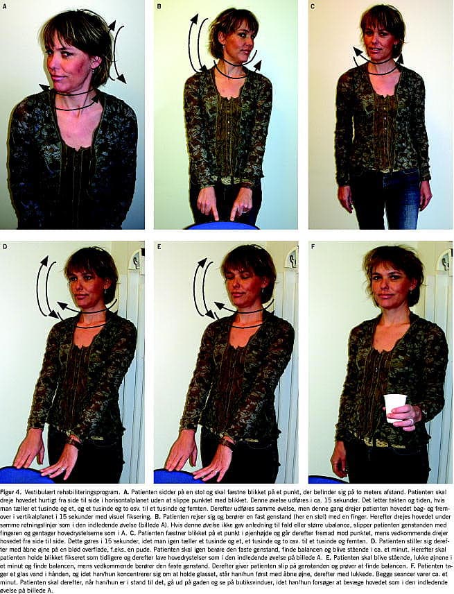 Det raske vestibulære organ, synet, det somatosensoriske system og tilknyttede centrale integrationsbaner kan i vid udstrækning kompensere for det unilaterale vestibulære deficit ved fysisk træning, men mange patienter vil dog have permanent oscillopsi ved hurtige hovedbevægelser. Central kompensation ved sådanne dynamiske symptomer inddrager flere centrale strukturer og reflekser, f.eks. vestibulospinale og vestibulookulære baner [35]. Kompensationen forbedres og indtræder hurtigere ved øvelser og bevægelser, der centralt opfattes som inkongruente stimuli, således at der opnås såkaldt sensorisk mismatch. Ved disse øvelser bliver patienten svimmel, hvilket patienten skal oplyses om, idet det intuitivt føles rigtigst at undgå bevægelser, der udløser svimmelhed. I et prospektivt randomiseret studie har man påvist, at fysisk træning efter NV er virksomt i opretholdelse af postural stabilitet [36]. Vestibulær rehabilitering rekommanderedes først af Cawthrone i 1944 [37] og modificeredes senere af diverse forfattere, der påviste, at den centrale kompensation trænes ved: 1) aktive hovedbevægelser, således at VOR rekalibreres, 2) forbedret blikstabilitet ved voluntære øjenbevægelser og -fikseringer og 3) balancetræning og gangøvelser for at forbedre det vestibulospinale system, hvorved postural stabilitet og voluntære bevægelser kan udføres mere præcist [28, 36, 38]. Figur 4 beskriver et træningsprogram, der med fordel kan tilbydes alle patienter med unilateral vestibulær defekt.