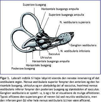 Ved temporalbensundersøgelser [13] og tredimensionale buegangsundersøgelser har man påvist, at det er nervus vestibularis superior, som rammes ved NV, hvorfor der i det typiske kliniske forløb ikke er tale om en total vestibulær parese som tidligere formodet [22], men en partiel unilateral vestibulær defekt [23]. Nervus vestibularis superior forsyner den anteriore og den horisontale buegang, utriculus og en ubetydelig del af sacculus, hvorimod nervus vestibularis inferior forsyner den posteriore buegang og størstedelen af sacculus (Figur 1). Der findes flere studier, hvis resultater underbygger argumentationen for, at det er nervus vestibularis superioris, der er afficeret ved NV, idet patienter samtidigt og samsidigt kan have NV og posterior buegangs-BPPV [24]. Man ser en normal undersøgelse ved vestibular evoked myogenic potential (VEMP), som er en sacculusspecifik undersøgelse. I enkelte studier har man beskrevet affektion af nervus vestibularis inferioris (neuritis vestibularis inferioris) eller affektion af begge nervi vestibulares, men dette forkommer ikke særlig hyppigt [25-27]. Man forestiller sig, at nervus vestibularis superioris i tindingebenet løber i en knoglekanal, som er længere og har tættere relation til knoglen end den inferiore sidegren. Derved er den mere udsat for kompression og tryk under inflammationsprocessen. VEMP er ikke tilgængelig på de fleste øre-næse-hals-klinikker i Danmark, men dens funktionalitet i vestibulær differentialdiagnostik er fremragende. Med nyligt udviklet udstyr til vestibulær udredning kan man objektivisere otolitorganernes og buegangenes funktionalitet. Undersøgelserne kaldes subjective visual horizontal/vertical (SVH/SVV) og video head-impulstest (VHIT). Disse er klinisk gode, reproducerbare og valide differentialdiagnostiske undersøgelser, som kun udbydes på et fåtal steder i Danmark.